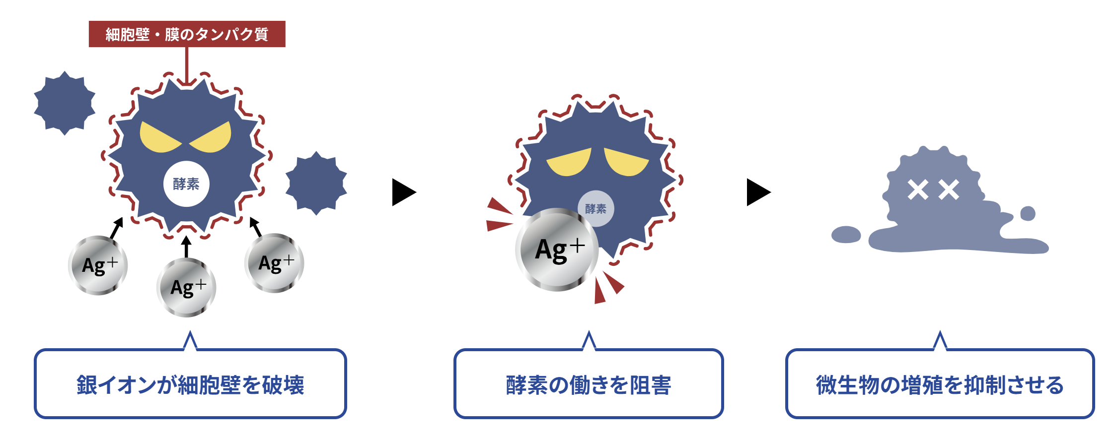 Bactekiller無機銀離子抗菌劑透過銀離子釋放,來破壞細菌的細胞壁、細胞膜的蛋白質,細菌無法繼續存活,抑制細菌的繁殖,達成抗菌的效果。